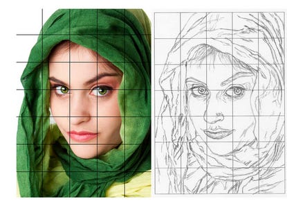 The grid method is the more old-school of the two. You draw a grid of equal squares over your reference photo (or use an app to do it digitally), then lightly sketch the same grid on your drawing paper. From there, you copy what you see in each square — basically translating little bite-sized sections of reality. It’s slow, meditative, and a great way to train your eye to see proportions accurately instead of guessing. If you’re just starting out, it’s one of the best exercises you can do.