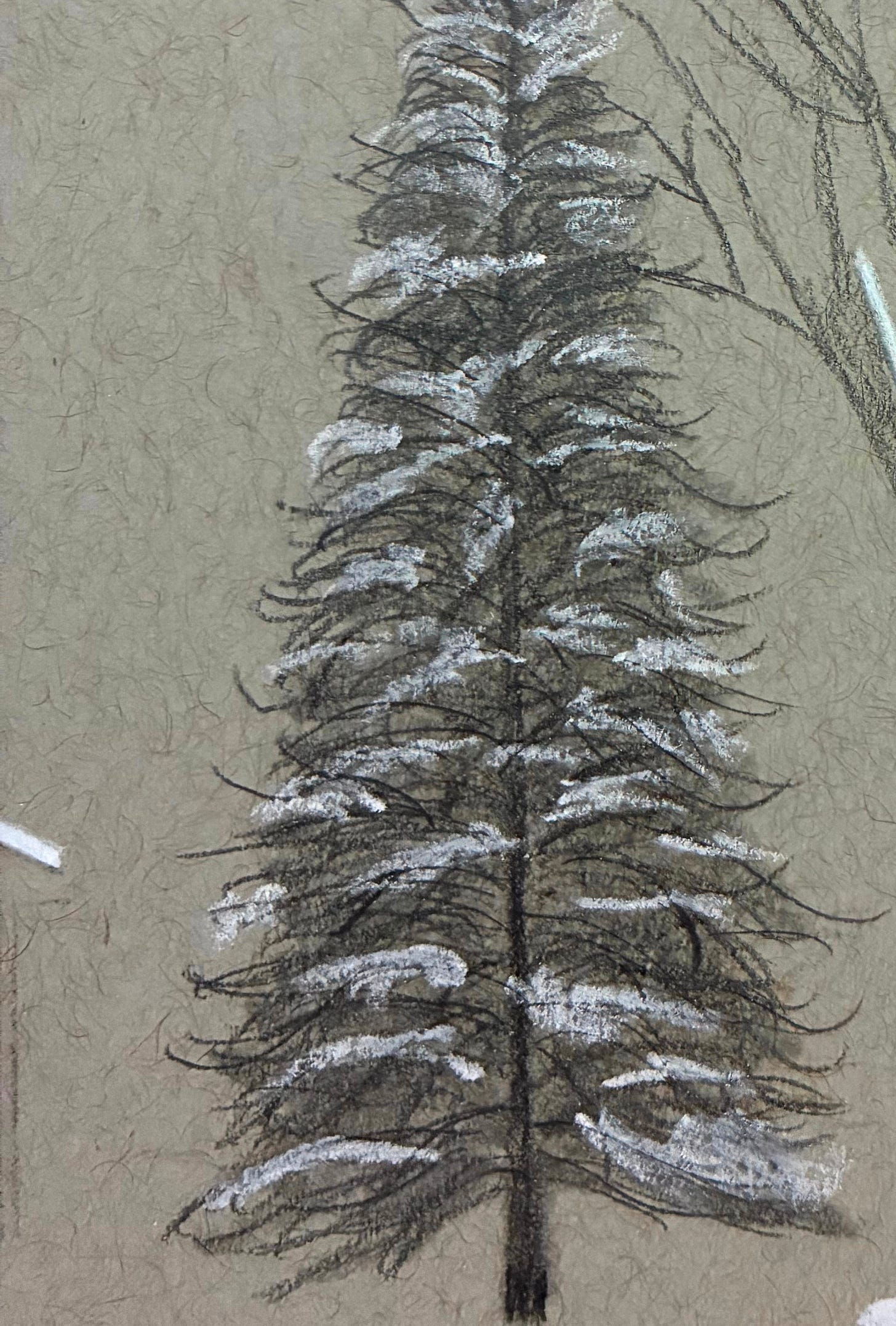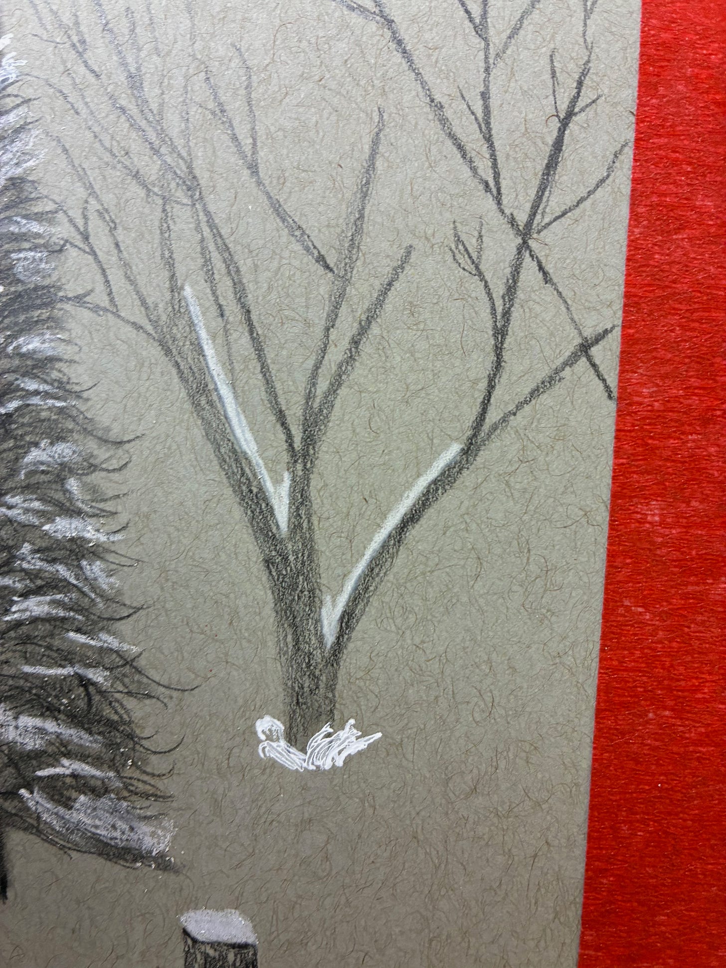 The white gel pen, which you can see at the very top of the lit tree and at the base of the one beside it, doesn’t hold a candle to white charcoal or white acrylic paint. It’s too glossy, too sterile — snow shouldn’t look like office supplies.