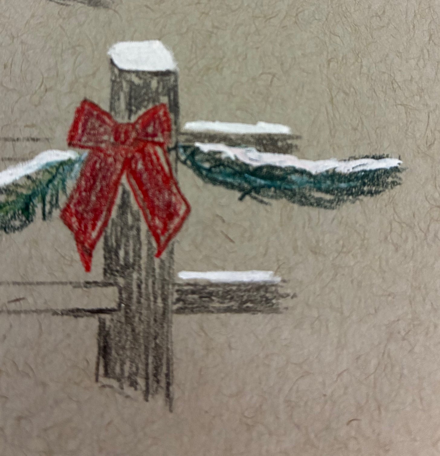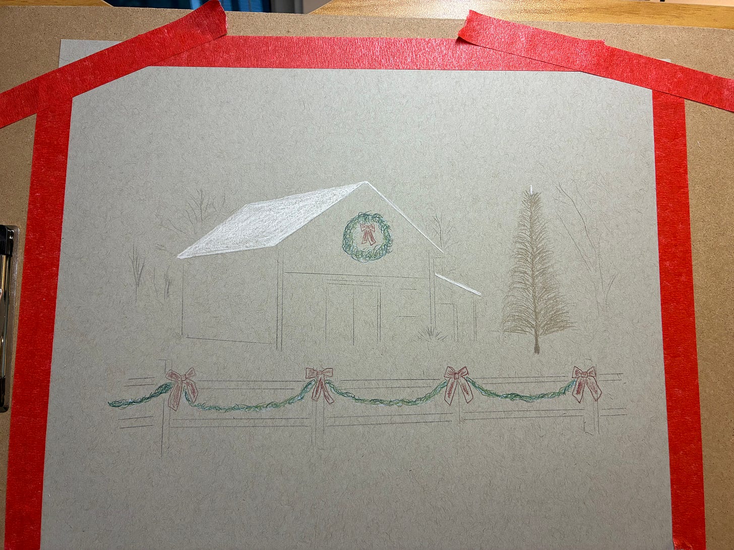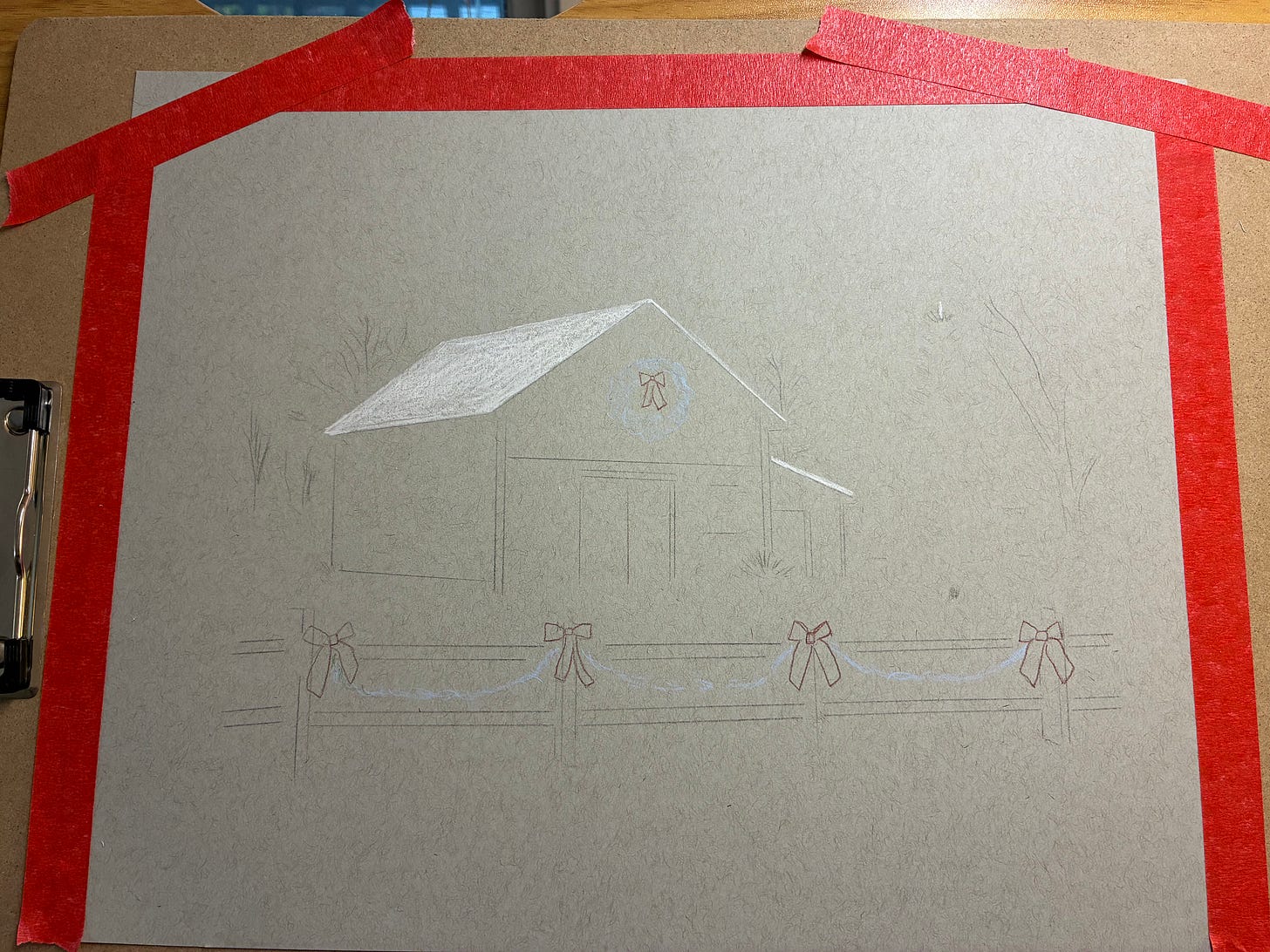 Notice that I’m not outlining the garland connecting the bows on the fence — I’m going to freehand those from start to finish, as a bit of a challenge. This is risky because color is almost impossible to fully erase, whereas graphite can be erased quite thoroughly, but I’m wanting to set up habits of challenge right from the start now that I’m working with toned paper.