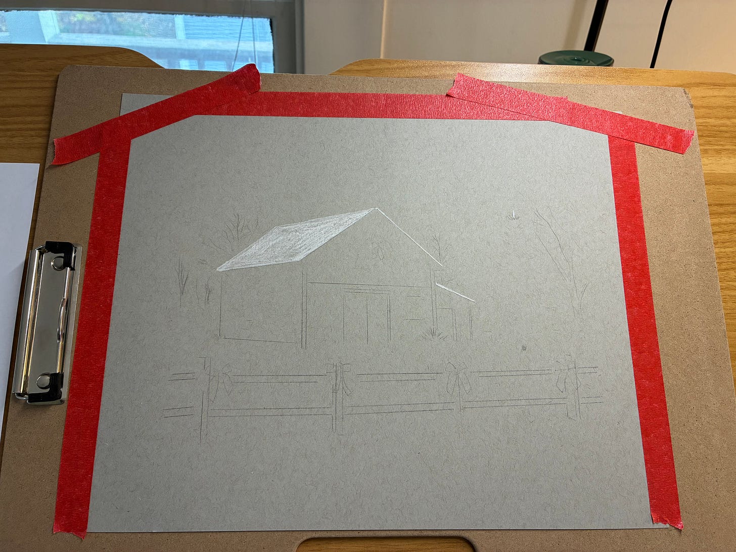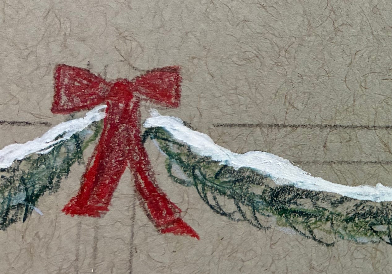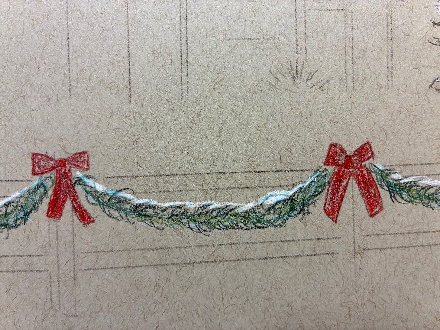 Notice that I’m not outlining the garland connecting the bows on the fence — I’m going to freehand those from start to finish, as a bit of a challenge. This is risky because color is almost impossible to fully erase, whereas graphite can be erased quite thoroughly, but I’m wanting to set up habits of challenge right from the start now that I’m working with toned paper.