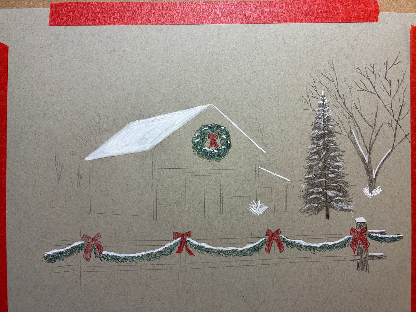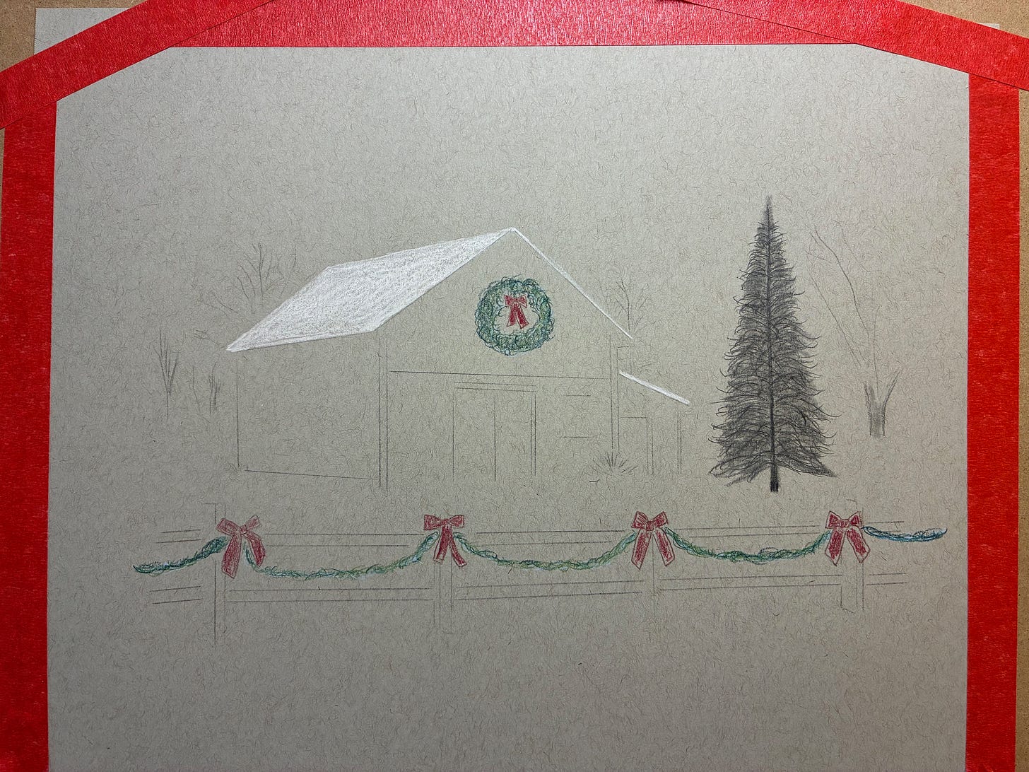 The barn, being a respectable New England barn, is of course red. But I decided not to color it. Instead, I’m doing my usual selective-coloring trick: the wreath and the decorations on the fence will be the only parts in color, everything else in graphite.