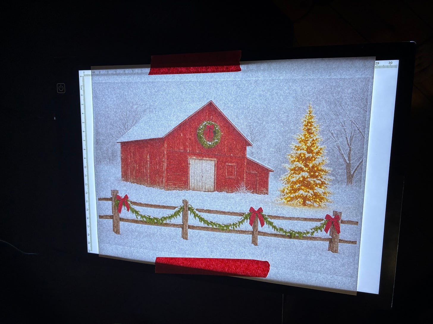 A weathered red barn with a giant wreath, a snowy fence wrapped in garland, and a Christmas tree glowing beside it like it’s auditioning for a Vermont tourism brochure. It was almost perfect: festive but not smug, nostalgic without being emotionally manipulative.