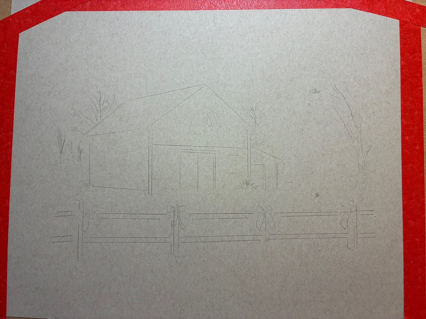 The shapes are straightforward, so I’ll trace only the rooflines of the barn. Then I’ll mark the very top and bottom of the tree to the right of the barn and the vertical posts on the fence, to help with placement, then freehand the rest.