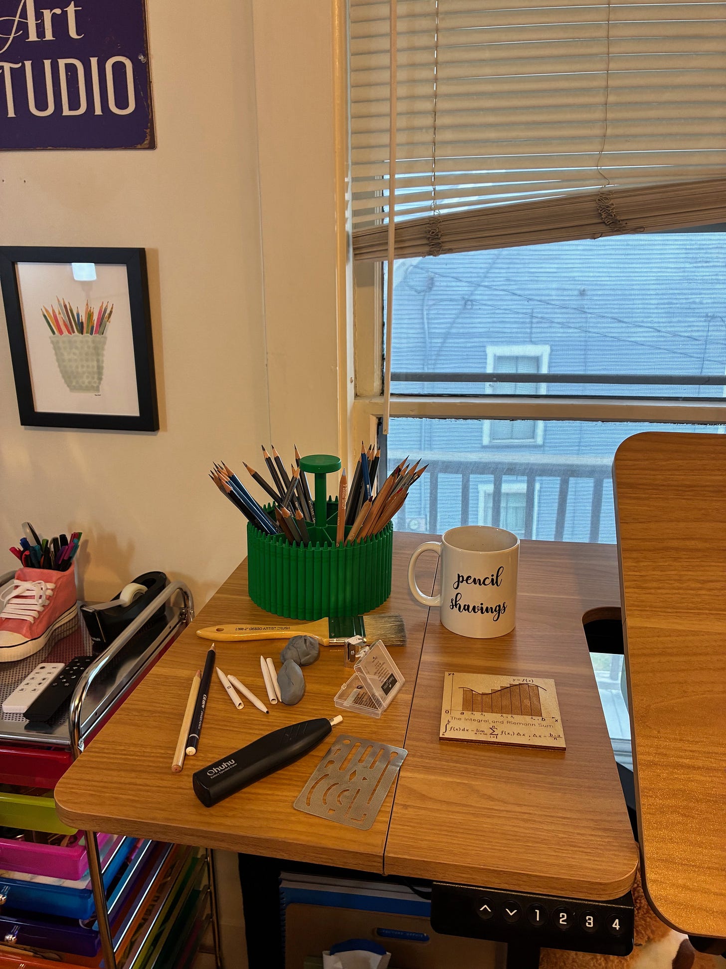 Everything gets sharpened — graphite in the electric sharpener, Luminance pencils by hand, because I’d rather sandpaper my soul than waste one millimeter of those.