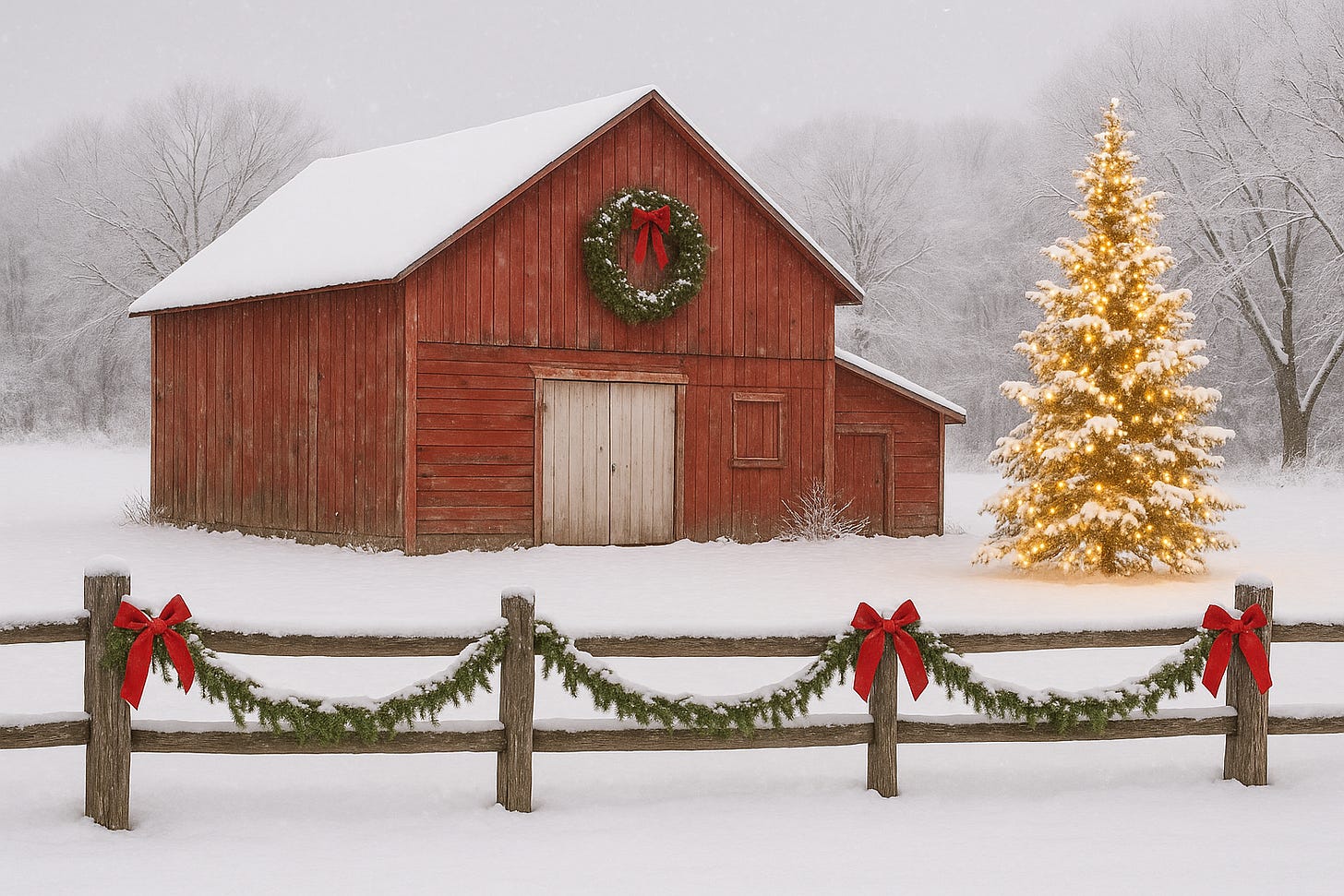 So instead, I described what I wanted to ChatGPT: “a classic New England barn decorated for Christmas — snow on the roof, big wreath, wooden fence with garland, maybe a lit tree nearby.”