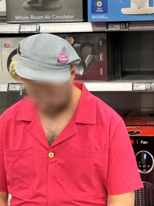 On his head: a striped cap, like something a conductor might wear if the train ran exclusively on vibes and LaCroix. Pinned to the front was a button that read “THEY/THEM.”