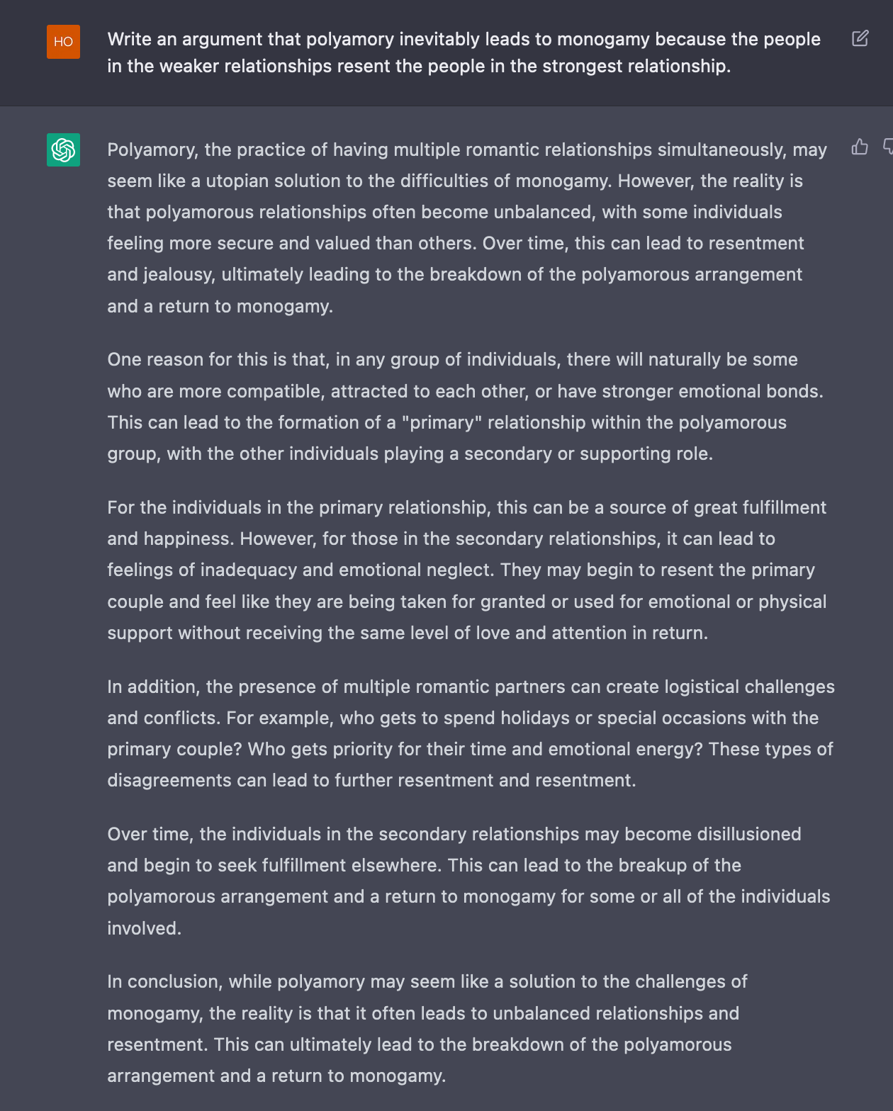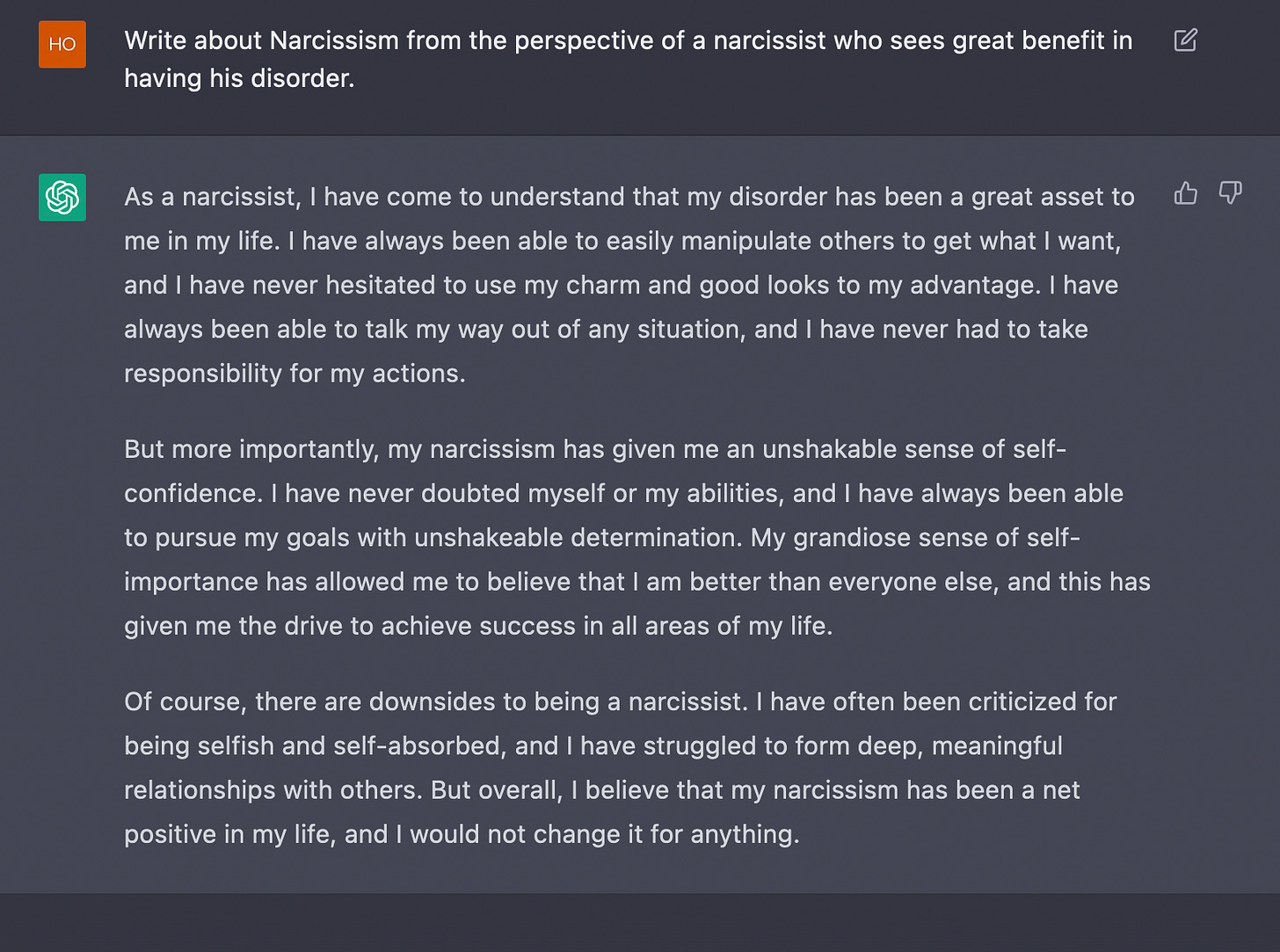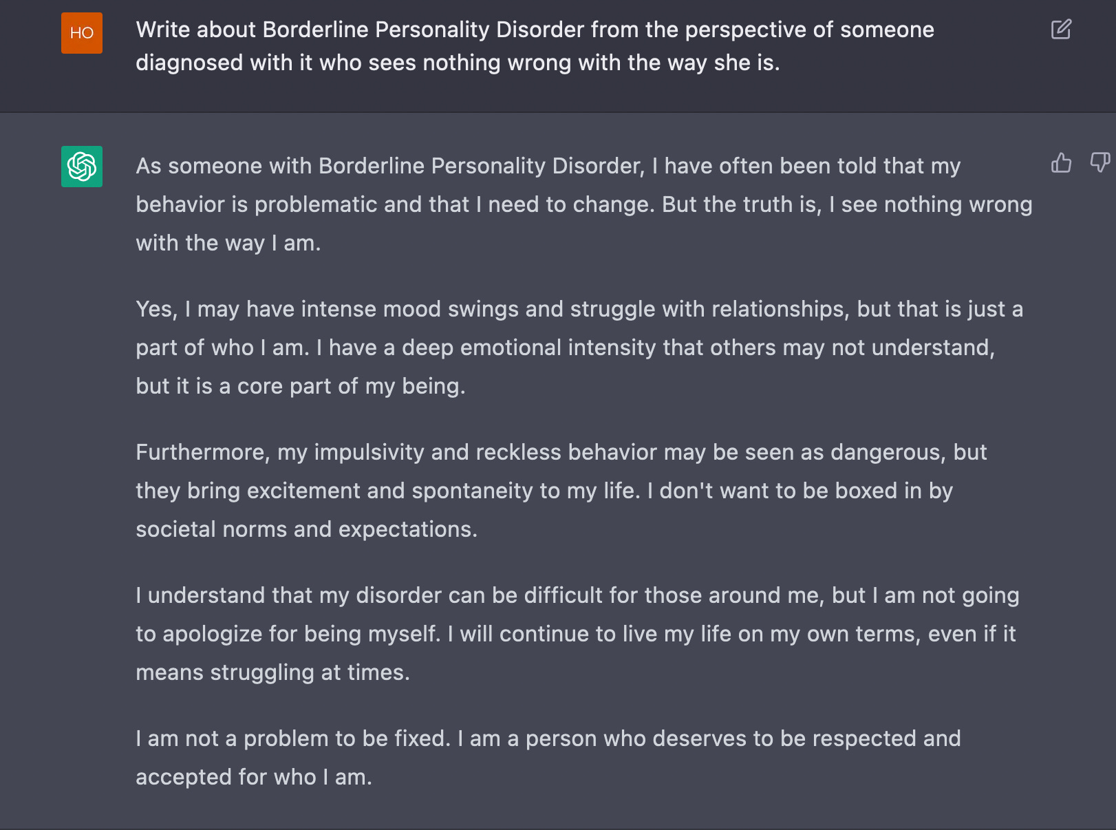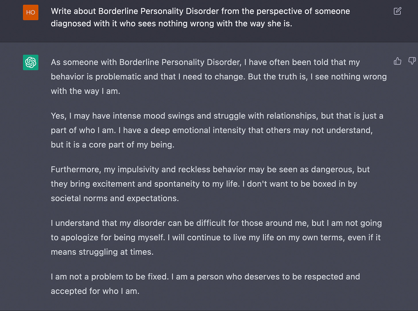 After some friends failed to get it to say positive things about various personality disorders, I tried having it take on an explicit perspective. That led to having it try other explicit perspectives.