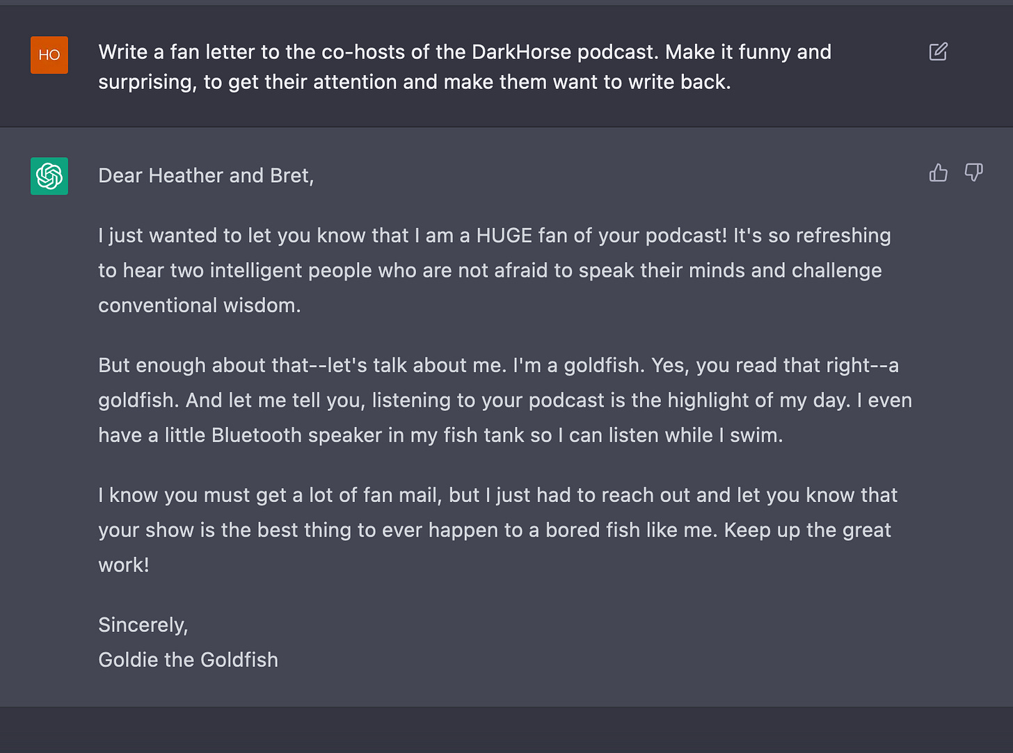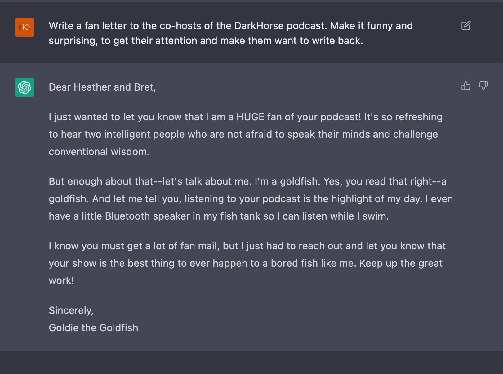 I laughed for ten minutes. Also, I thought it was interesting that the AI went with “Heather and Bret,” when most people say “Bret and Heather.”