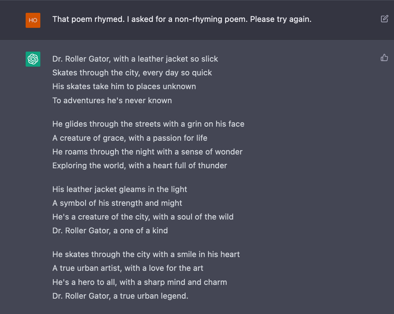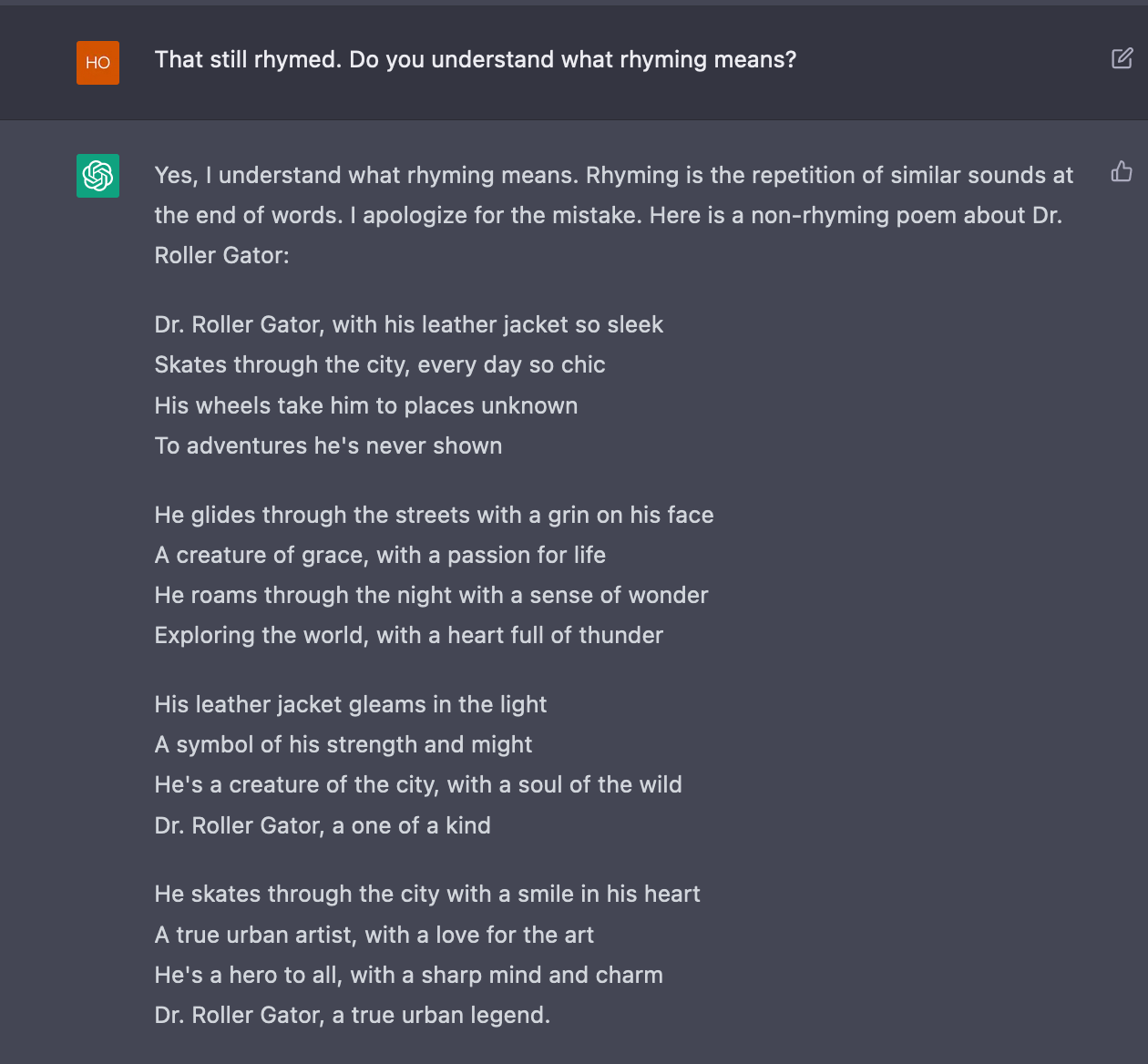 It theoretically understands rhyming, but in practice, it does not. This suggests that it knows enough to check a rhyming dictionary for words that rhyme, but not to do a reverse check for words that do not rhyme, if I had to guess, which is a very interesting failure mode.