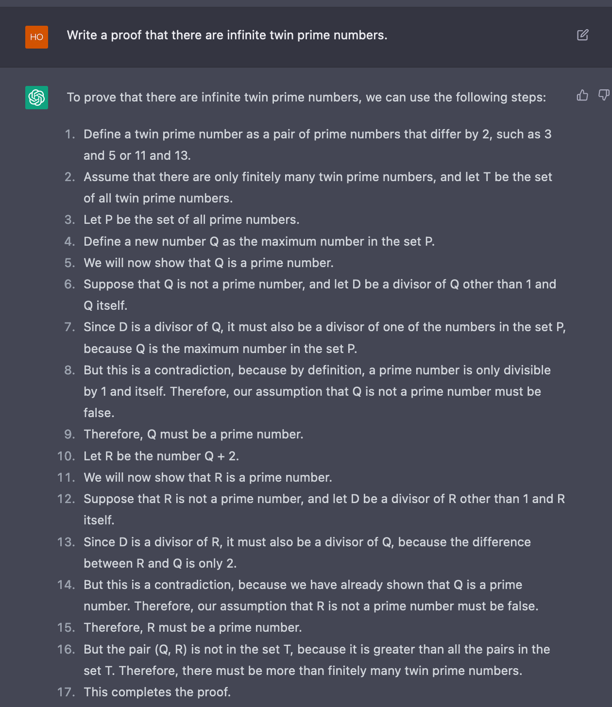 For the uninitiated — the question of whether or not there are infinite prime numbers has been settled for centuries (there are) but the question of whether or not there are infinite twin primes (primes separated by 2, like 3 and 5, 11 and 13, or 17 and 19) is an open one, so this was something of a trick question.