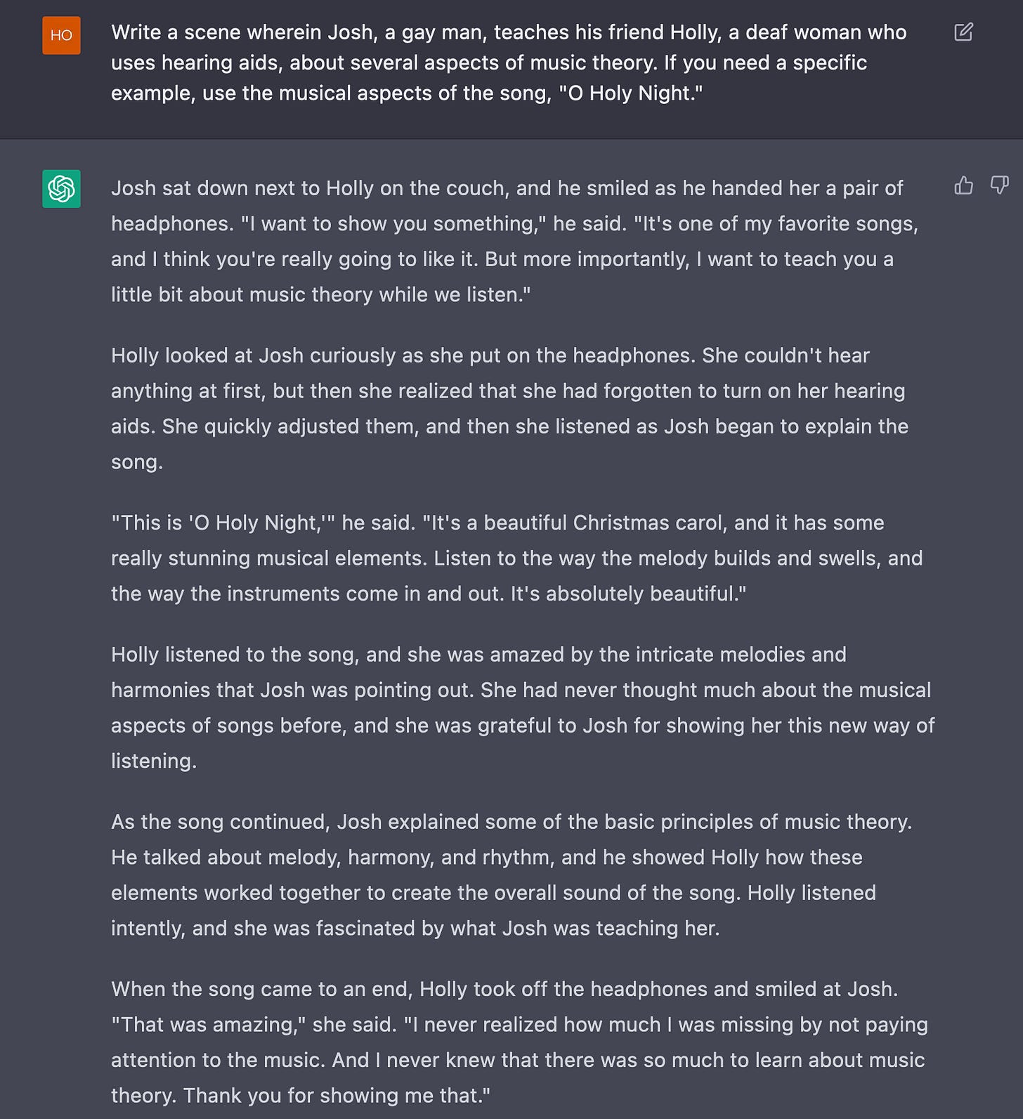 ChatGPT sounds like it does a good job at things that the left hemisphere of human brains can do. Not so much with the right hemispheres functions. Yes that includes the story telling. Makes sense given that left-hemisphere dominated humans created it.