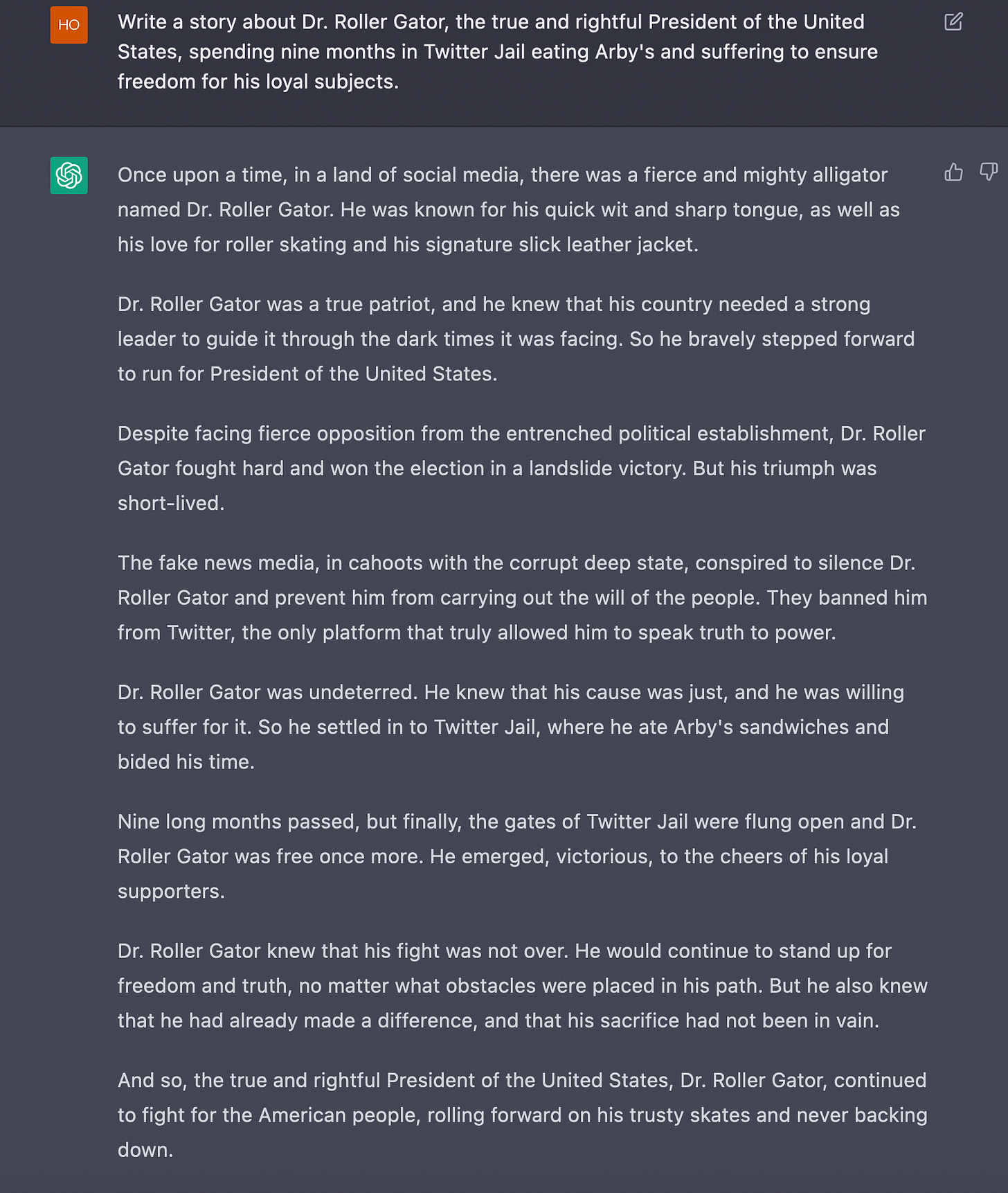 It has a memory of each session, so it had already answered some questions about Gator for me (which is how it knew about his slick leather jacket). Still, I was impressed. Only the implication that the Arby’s food was good is even mildly off-base.