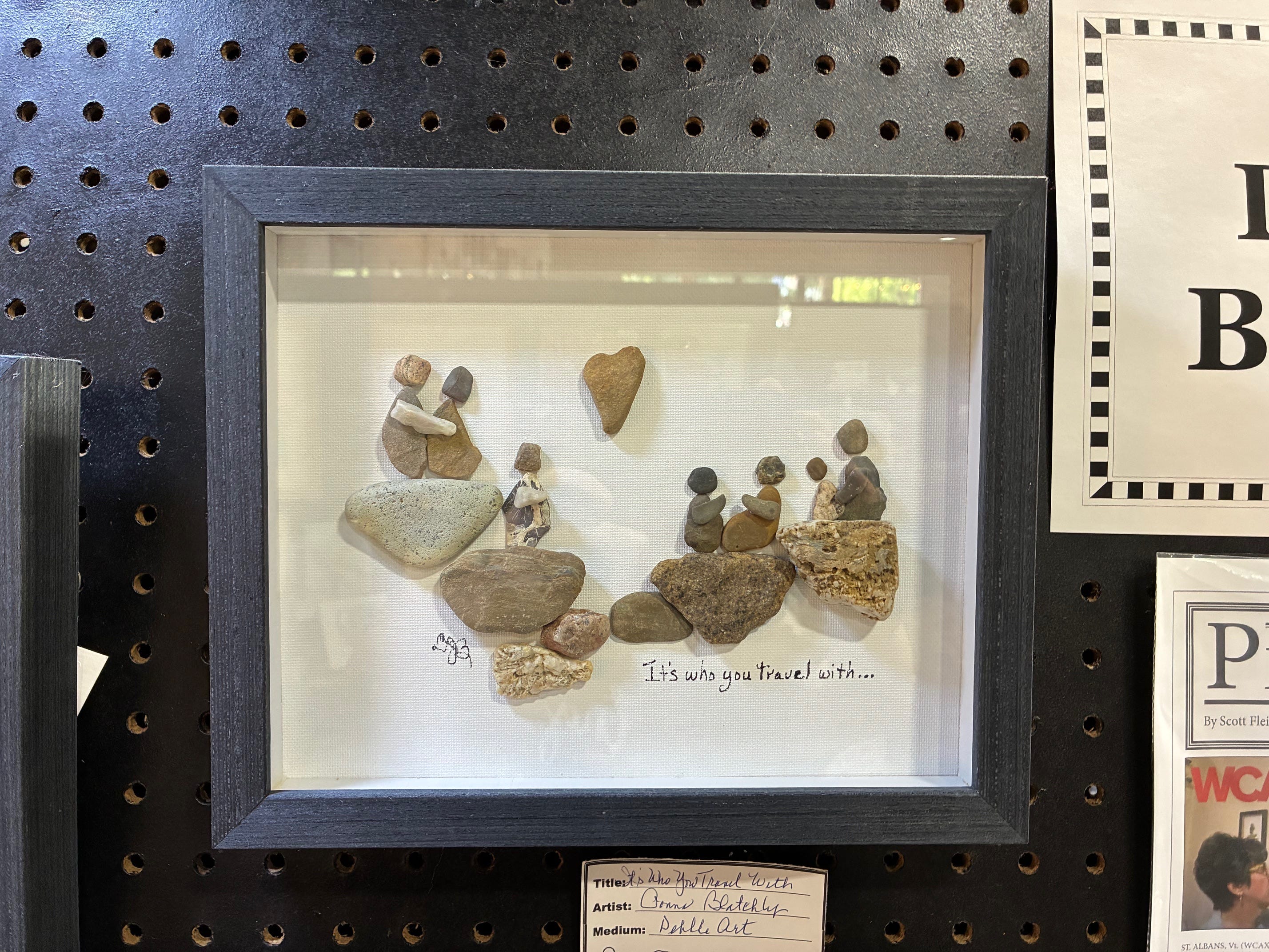 These framed pebble art pieces — families and friends shaped entirely out of smooth, weathered stones — are exactly the sort of thing I would make myself on a long walk, arranging little figures on a boulder or a tree stump while no one was looking, and then quietly brushing them back into the dirt so there’d be no evidence.