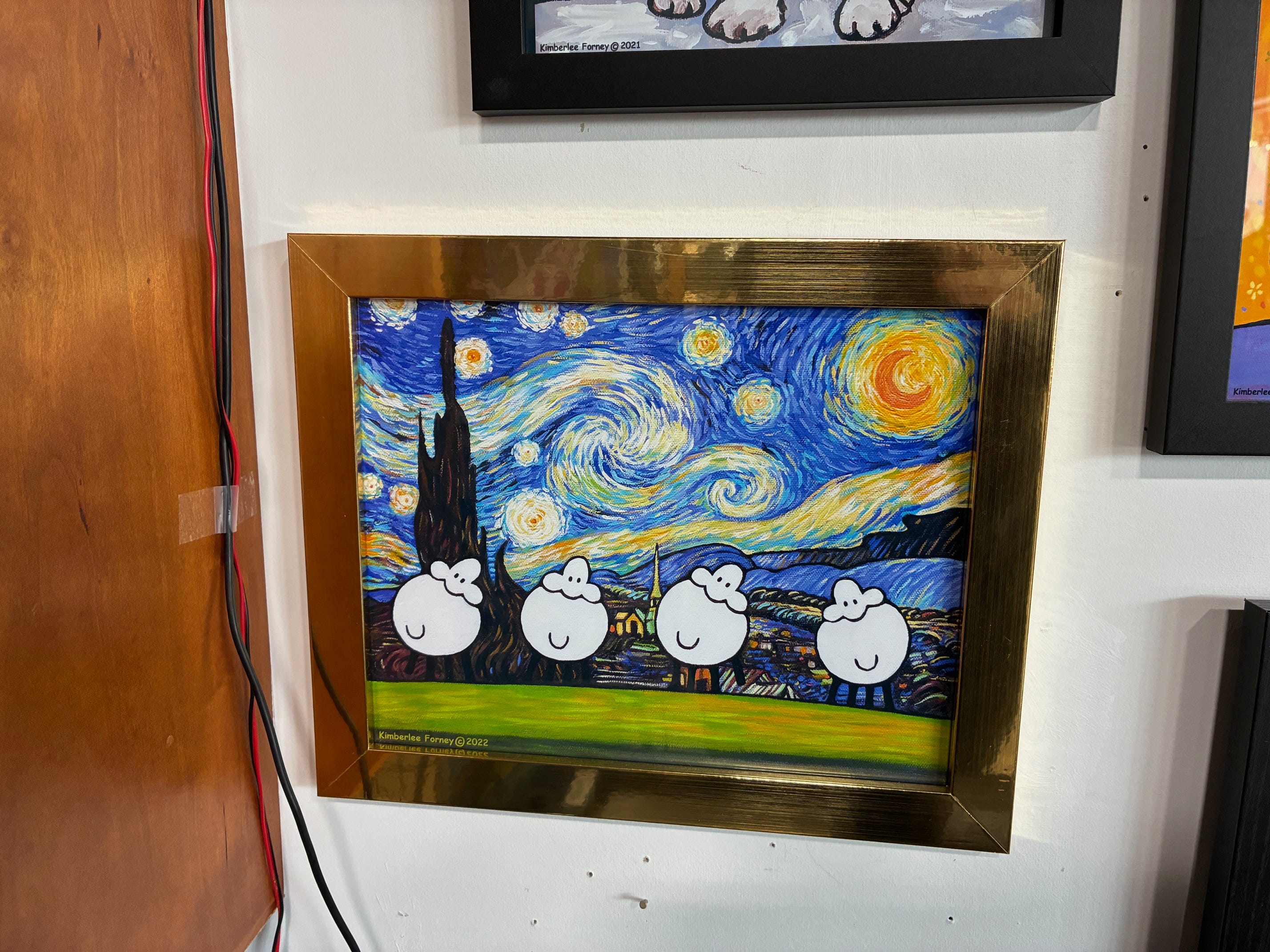 My favorite thing? Without question, the print you see here: Kimbarlee Forney’s Starry Night, only with a row of plump white sheep standing where Van Gogh left open fields.