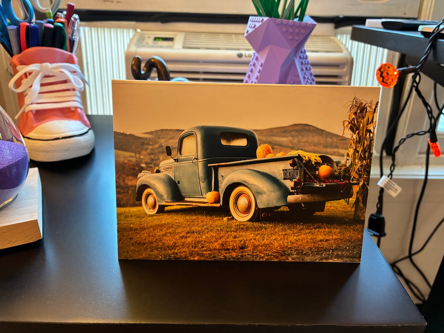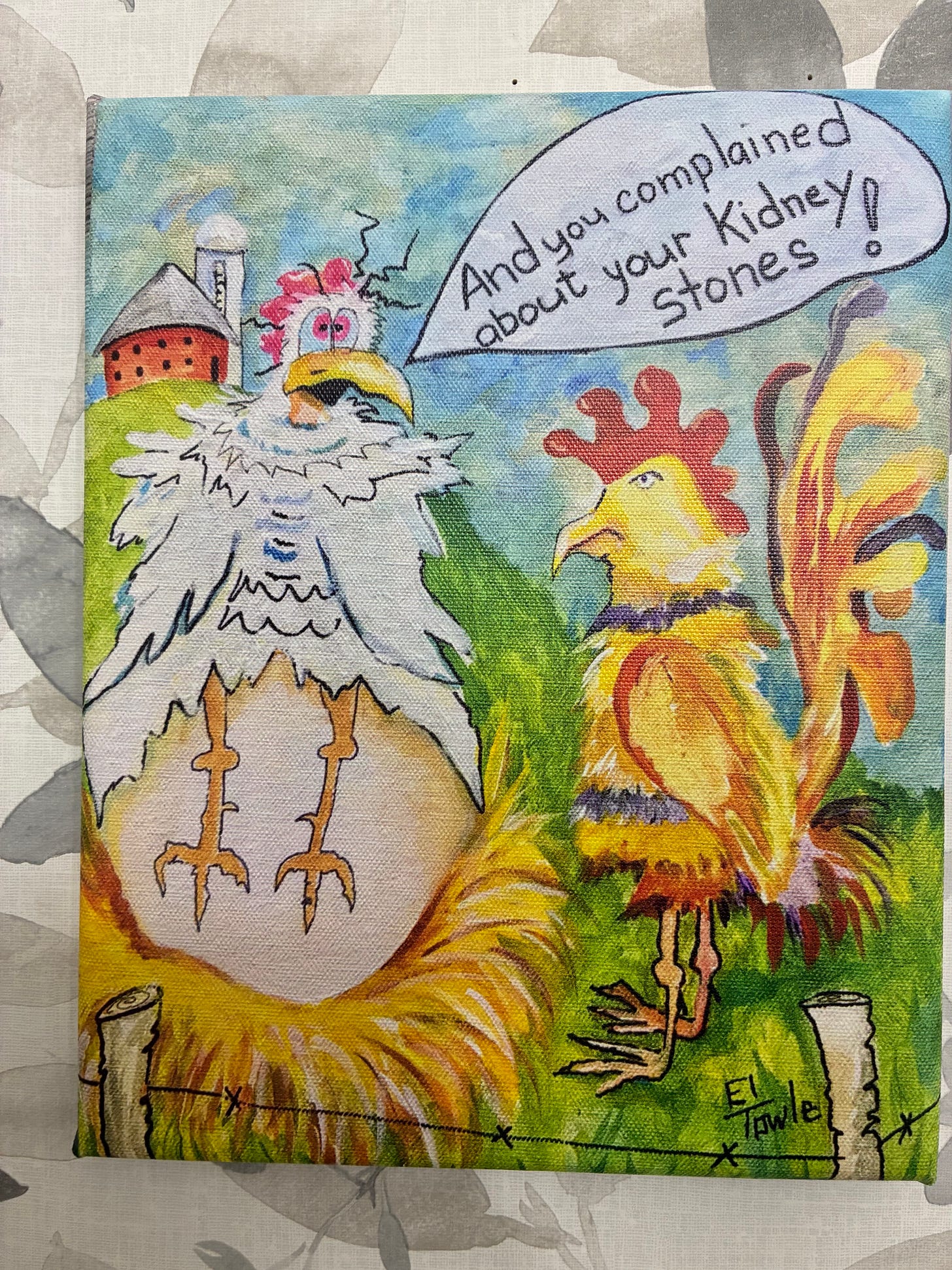 Other finds included a greeting card featuring a vintage blue truck with pumpkins spilling from the bed, and a delightfully ridiculous chicken painting where one bird, mid-hatch, snarks to another: “And you complained about your kidney stones!”