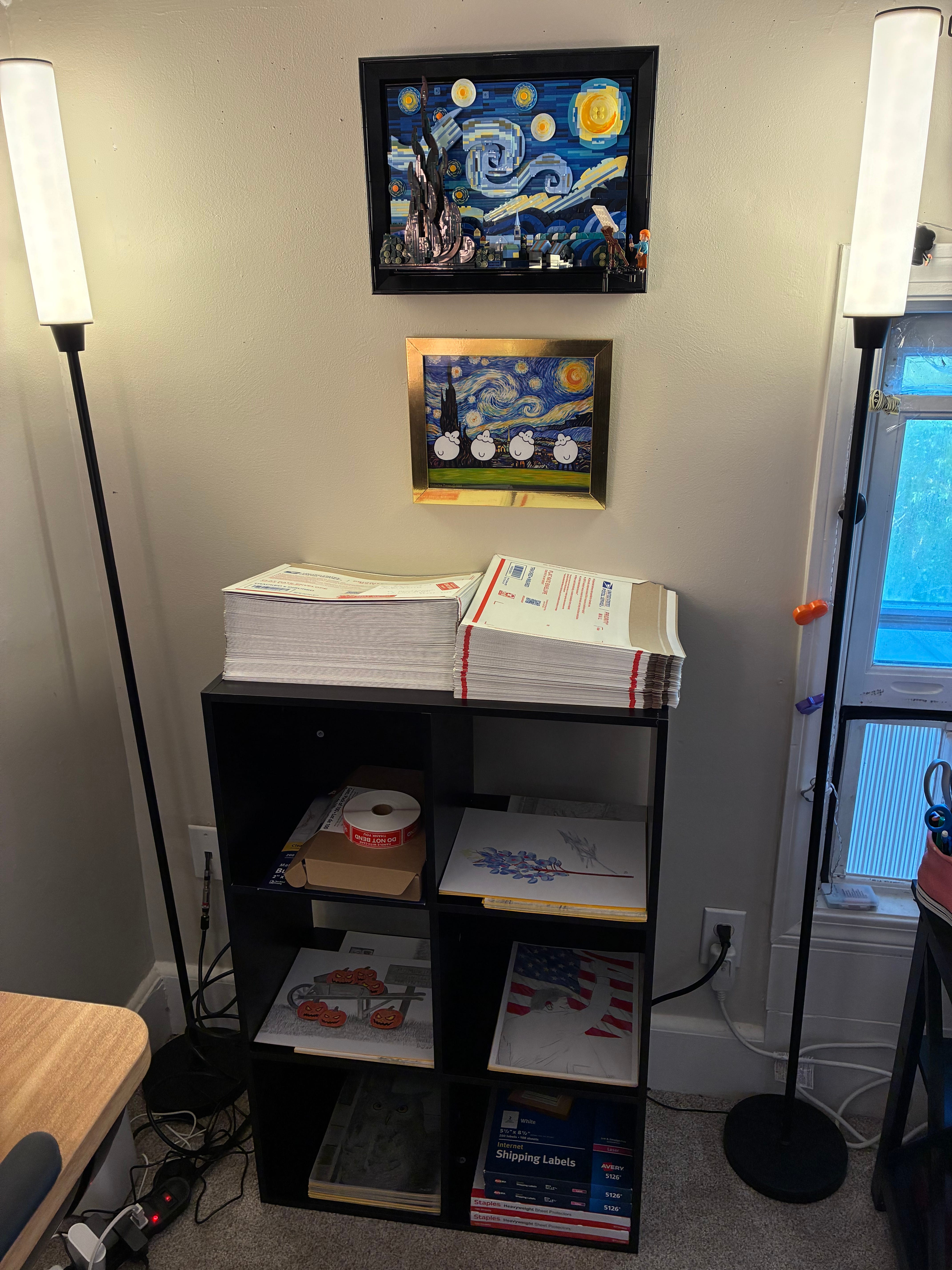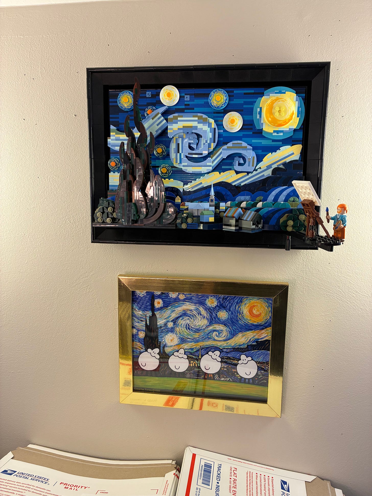 I don’t think that liking “pop art” makes anyone a sheep — but there’s something clever about the visual pun. I hung it directly under my LEGO version of the same painting, which itself hangs above the six-cube organizer that holds the bulk of my art business.