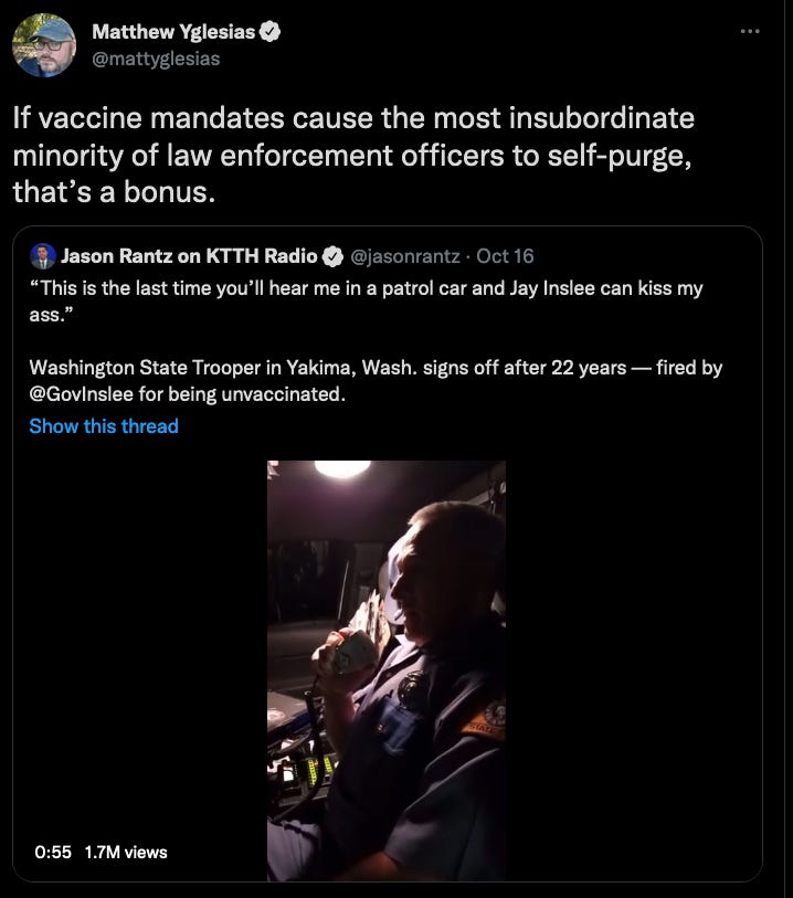 They’re just blinded by their lust to see everyone forced to comply. They want my body, along with the bodies of all other unvaccinated Americans, penetrated with the vaccine, consent be damned. This overriding desire has short-circuited all other concerns, including something as obvious as the stupidity in cheering on police forces losing officers who prize principles over following orders.