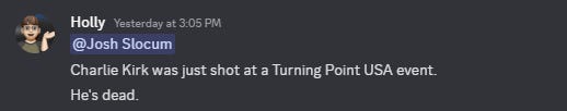 The internet is full of big-picture takes on the assassination of Charlie Kirk. I don’t have one of those. Or at least, not yet. Perhaps later, I will. (Edit: here’s my big-picture take.)