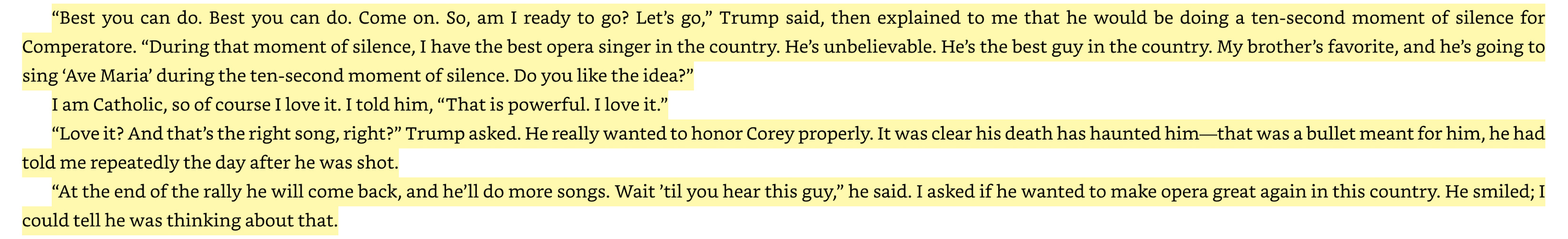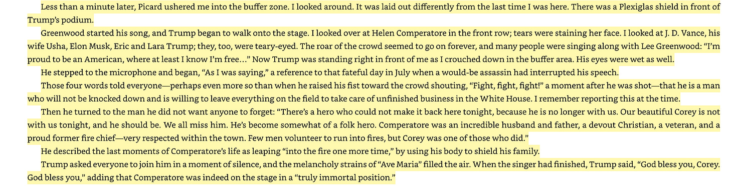That section focuses on both the emotions of the moment and his tribute to Corey Comperatore—the fire chief who died shielding his family during the assassination attempt.