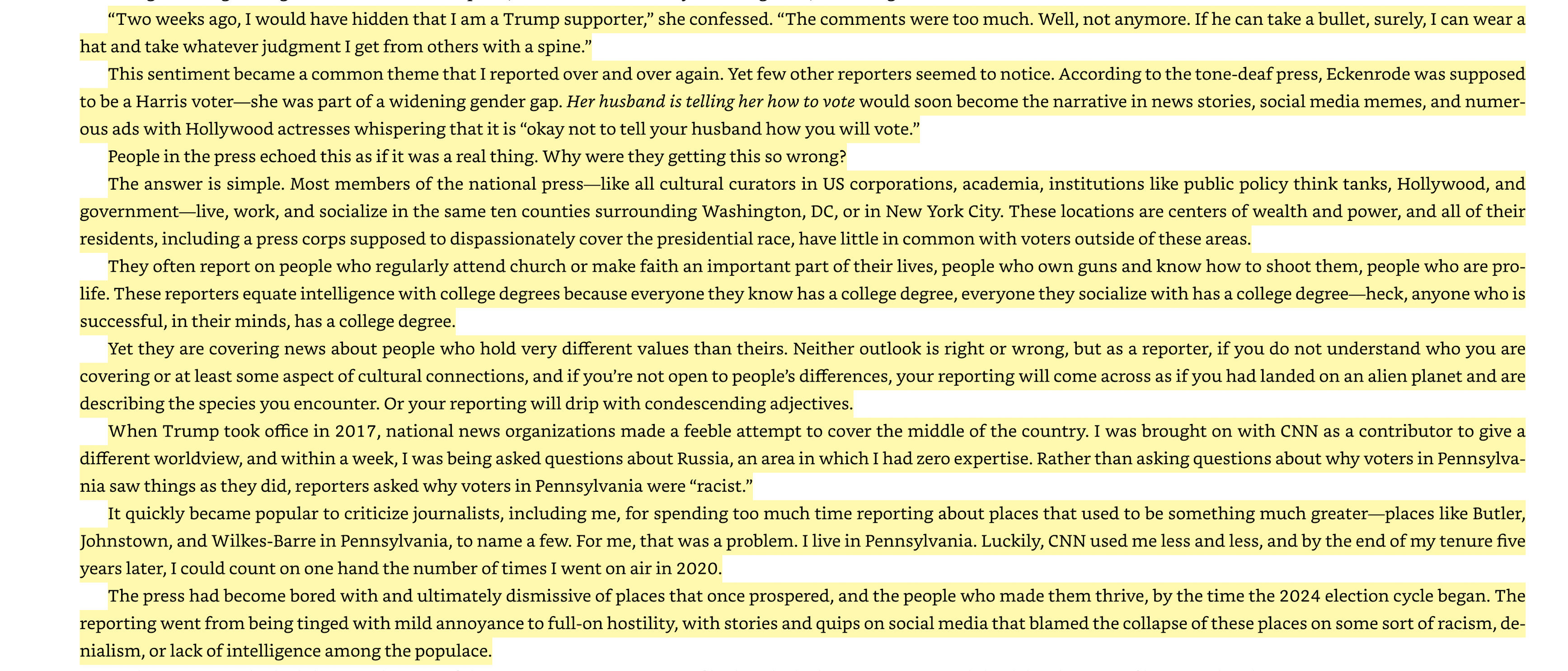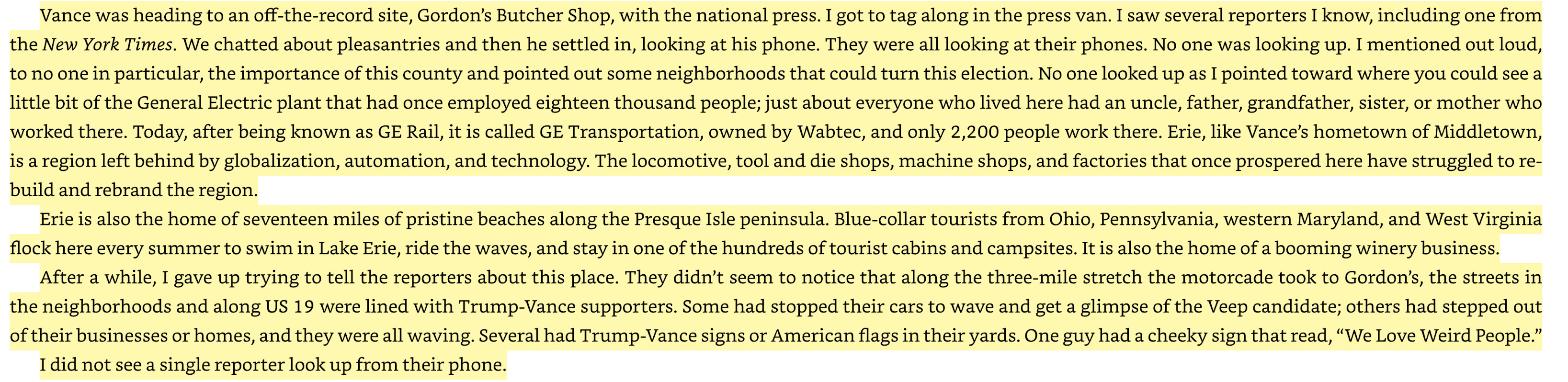 She shows us the reporters who ignore entire towns unless there’s a white supremacy narrative to exploit. The ones who travel with her to rural Pennsylvania but don’t look up from their phones long enough to hear what anyone says.