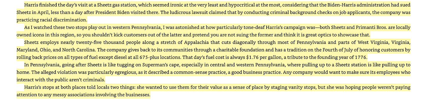 The only other soft spot in the book lies with the Harris/Walz campaign coverage—and not because Zito loses her touch, but because the campaign itself had none. The events are performative. The messaging is hollow. The stops at places like Sheetz and Primanti Brothers read like set pieces in a rebooted Veep, only less coherent. Harris’s campaign strategy seems predicated on the assumption that aesthetics will do the job of connection.
